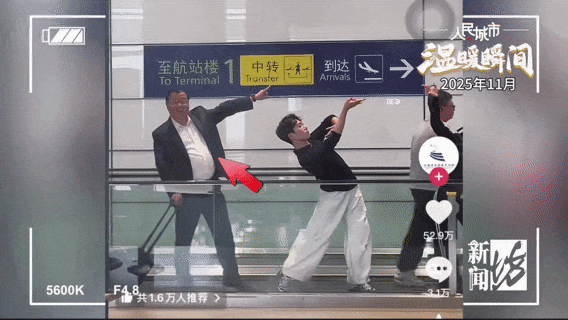 今年11月,云南一舞团发布了一则拍摄于浦东机场的快闪视频。当一位位专业舞者摆出“敦煌飞天”姿势在自动人行道上平移出画时,队尾一位路人大叔,也跟风摆出了一个姿势。