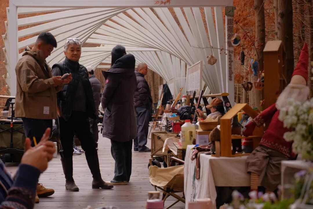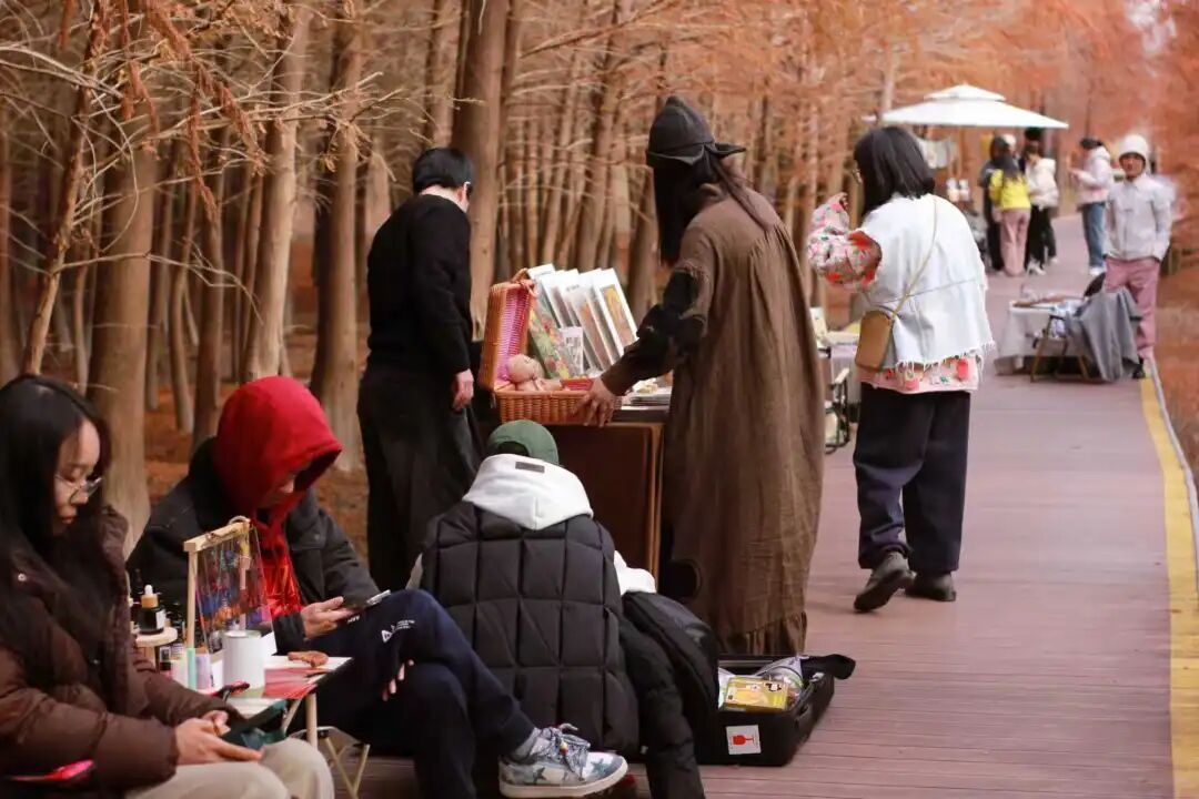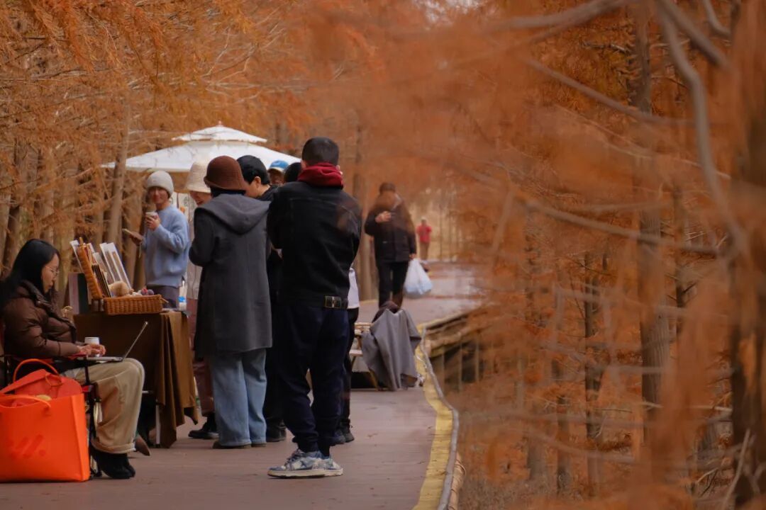 记者看到,活动现场人头攒动、暖意融融,市民游客循着西沙湿地水杉林的红叶而来,或驻足摊位前细细甄选手作好物,或定格红杉林与市集交织的美景,沉浸式享受户外休闲时光。20余个摊位沿街排布,手编玩偶、原创布艺、手工陶艺、精致银饰、定制花艺等好物琳琅满目,从传统篆刻到现代插画,从芳香好物到鸟类文创,再到中国茶、独木舟咖啡、手作面包等特色业态,涵盖多元品类,让人目不暇接。