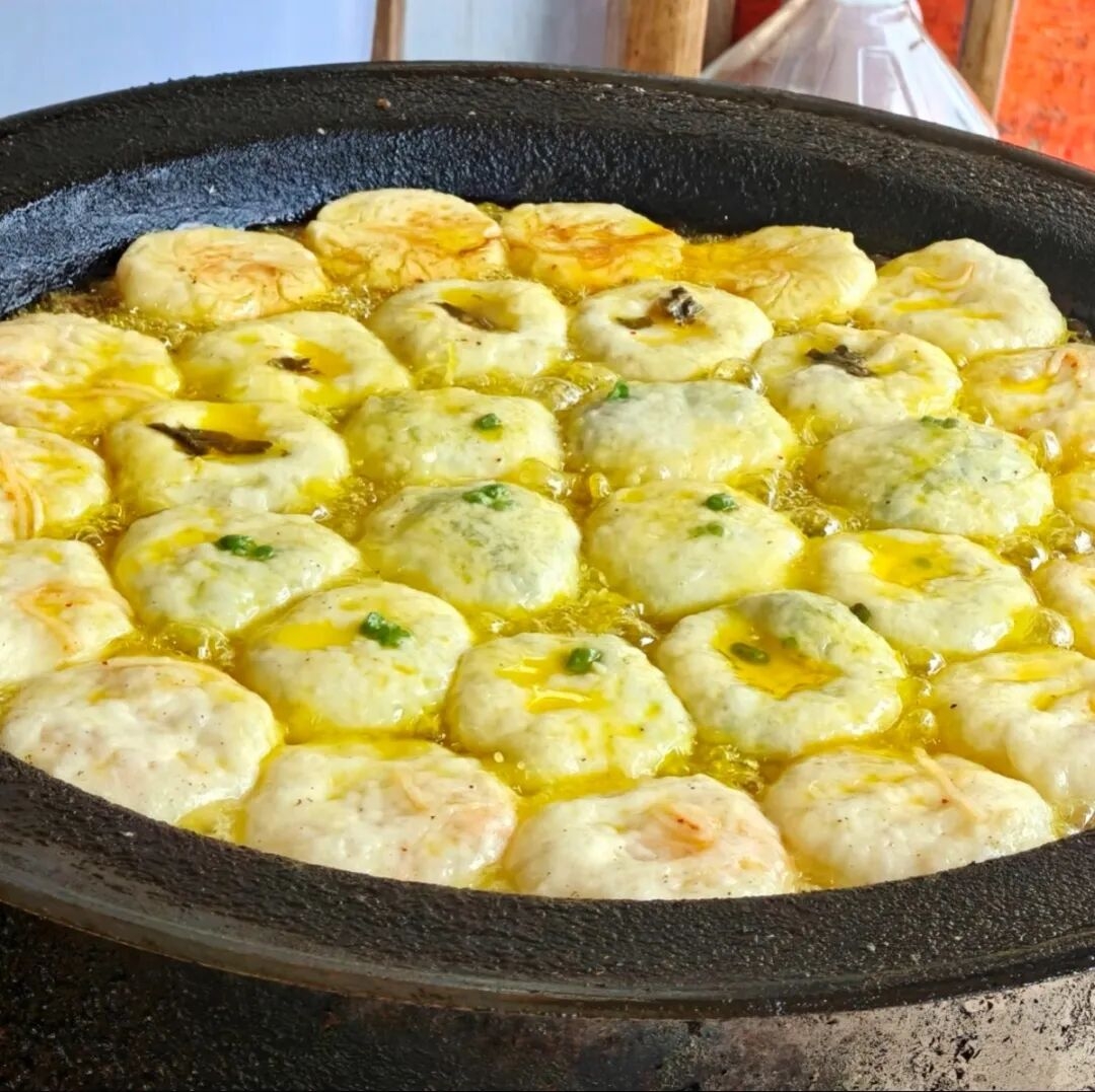 贵池小粑作为池州早餐的“扛把子”,以发酵面团包裹粉丝、萝卜丝、咸菜等素馅,经菜籽油煎焖至金黄酥脆,直径约8-12厘米。2022年入选安徽省“特色美食200道”。