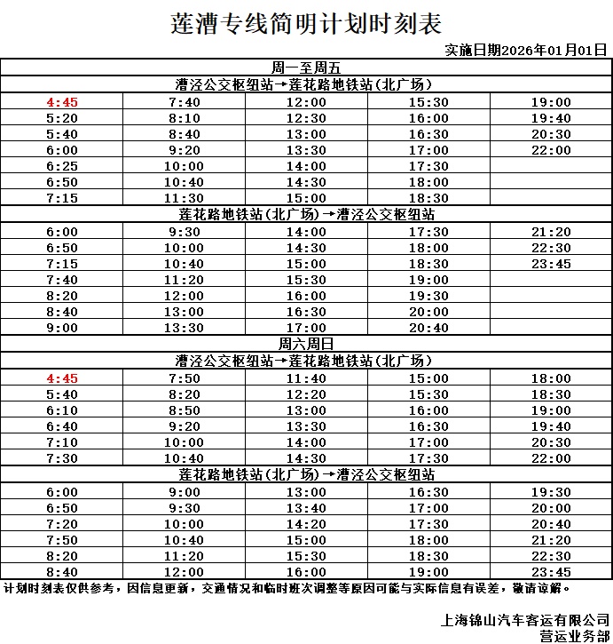 莲漕专线自2026年1月1日(星期四)首班车起,将优化线路走向并调整首末班车时间,具体情况如下: