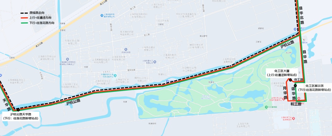 上行:自莲花路地铁站(北广场)起经沪闵路、S4、目华北路、沪杭公路、天华路、浦卫公路、漕廊公路、共建路、中一东路至漕泾公交枢纽站止。
