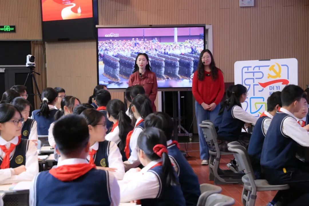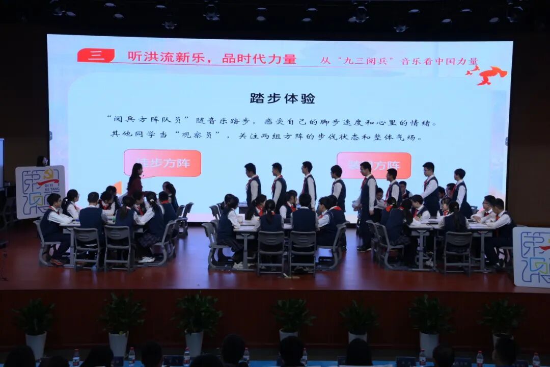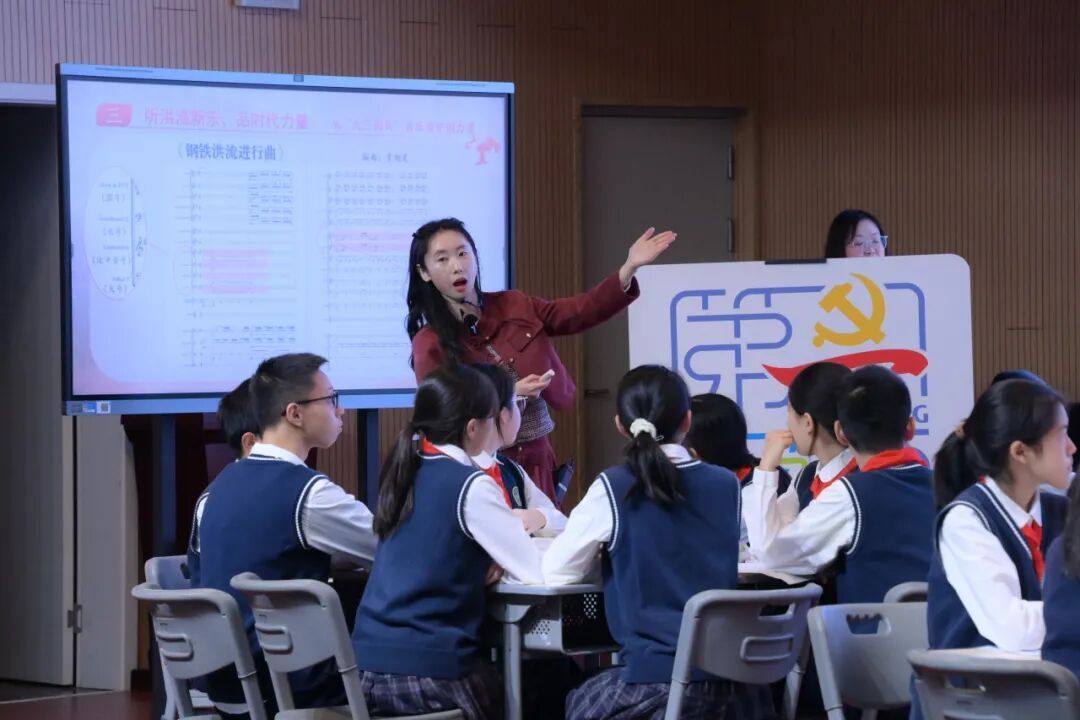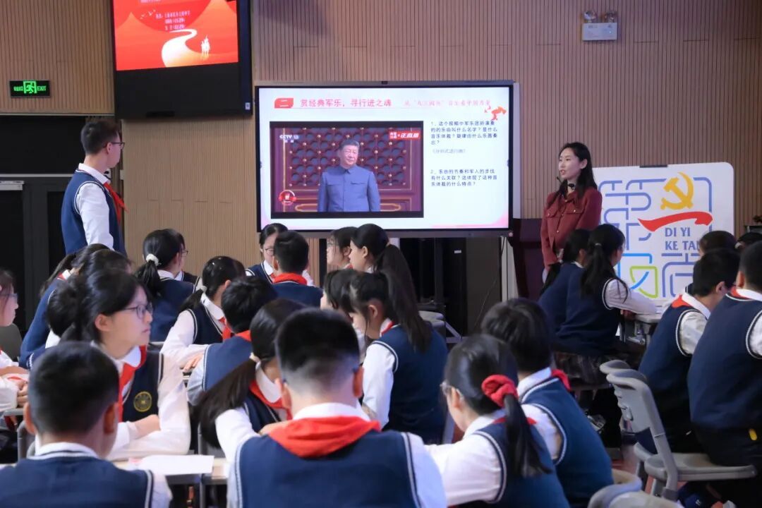 文绮中学音乐教师刘玮玏、道法教师宋月共同执教《赏析军乐华章,厚植爱国情怀》一课,将军乐赏析与思政教育深度融合。