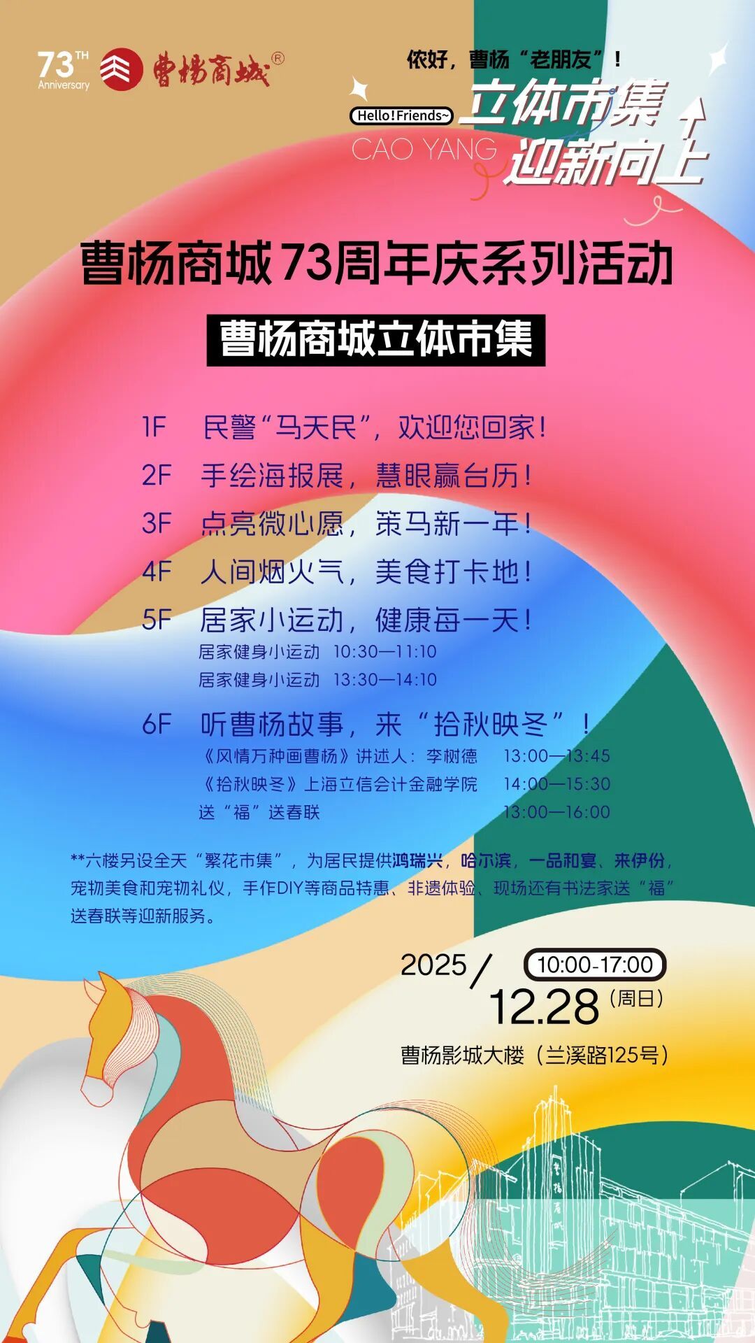 深耕社区73载,年均服务居民超百万人次,见证曹杨片区旧貌换新颜的老字号标杆——曹杨商城,即将迎来73周年庆。12月28日上午10点至下午5点,曹杨商城将化身为一座沉浸式体验空间,以立体打卡、重磅福利与温情互动,邀请市民朋友共赴一场特别的跨年聚会。 活动举办地:曹杨影城大楼 2025年,对曹杨商城而言意义非凡,不仅迎来了73岁生日,也正式启动了建筑与业态的全面焕新工程。在此过程中,商城坚守“闭店不打烊”的承诺,改造期间通过开设便民服务驿站,持续服务周边社区。 本次立体市集,正是商城依托影城基因、践行“不止于电影”理念的一次生动尝试。虽然商城的外壳在变,但那份扎根社区、服务邻里的初心与温度,永远在线。 此次店庆最大亮点在于打破平面格局,打造了一个完整的“立体打卡”体验。进入大楼,市民领取到的不仅是一张地图,更是一张开启多维度旅程的“时光车票”。 旅程从一楼的“时光剧场”启幕。经典电影《今天我休息》中广为人知的“民警马天民”将与身着年代服饰的NPC一同亮相,带市民重温往日时光。二楼“眼力竞技场”里,一幅融合曹杨历史风貌的“市井九宫格”等待破解,成功者有机会赢取仅73册的限量手绘电影海报台历。三楼则变身为“未来邮局”,可以在此写下一张寄往2026年的心愿明信片,一旁的咖啡馆还推出暖心折扣优惠,打卡后即可享专属折扣。四楼“烟火食堂”里,喷香的老上海菜肉馄饨等您品尝,行至五楼“活力充电站”,每日两场居家健身体验课带您焕活身心。六楼“文化会客厅”将成为活动的精神主场:聆听《风情万种画曹杨》的故事,参与“拾秋映冬”阅读分享,逛一逛汇聚手作好物的“繁花市集”,还可领取书法名家现场挥毫的“福”字春联,为新岁添一份圆满的仪式感。 集齐六个楼层的专属印章,不仅意味着一次充满趣味的探索,前73位完成者更能兑换特色民俗主题冰箱贴,把新年的“喜气”带回家。 12月28日,欢迎你在打卡与漫游中,收藏温暖,遇见惊喜,一起以“龙马精神”迎新年。 活动时间:2025年12月28日 10:00—17:00 活动地点:兰溪路125号曹杨影城大楼(全楼层) 编辑:郑长梦、吴兴婷 点击下方了解更多 半马苏河烟火气,跨年优惠享不停!普陀沉浸式文旅活动等你来打卡 金价创新高,普陀商圈活动助推购金热潮 2025年“上海工匠”揭晓,普陀三人上榜! 好戏不断!普陀这支越剧队成立十二周年 第二届“半马苏河·精彩普陀”主题摄影作品征集活动拟入选作品公示