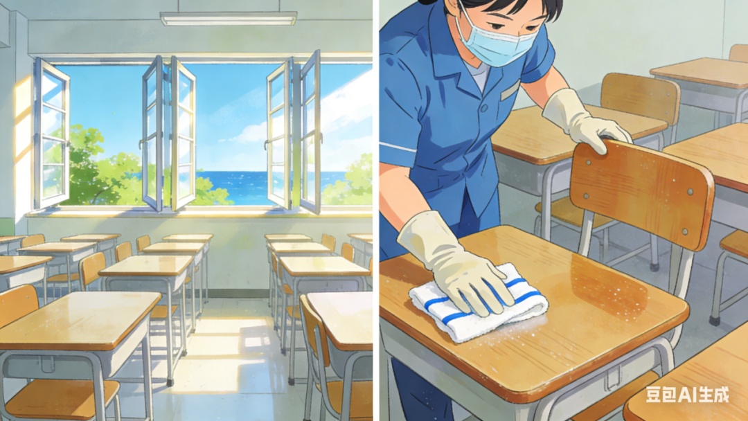 学校通过日常通风消毒及病例发生后的强化消毒措施,全方位维护校园环境卫生以阻断病毒传播。