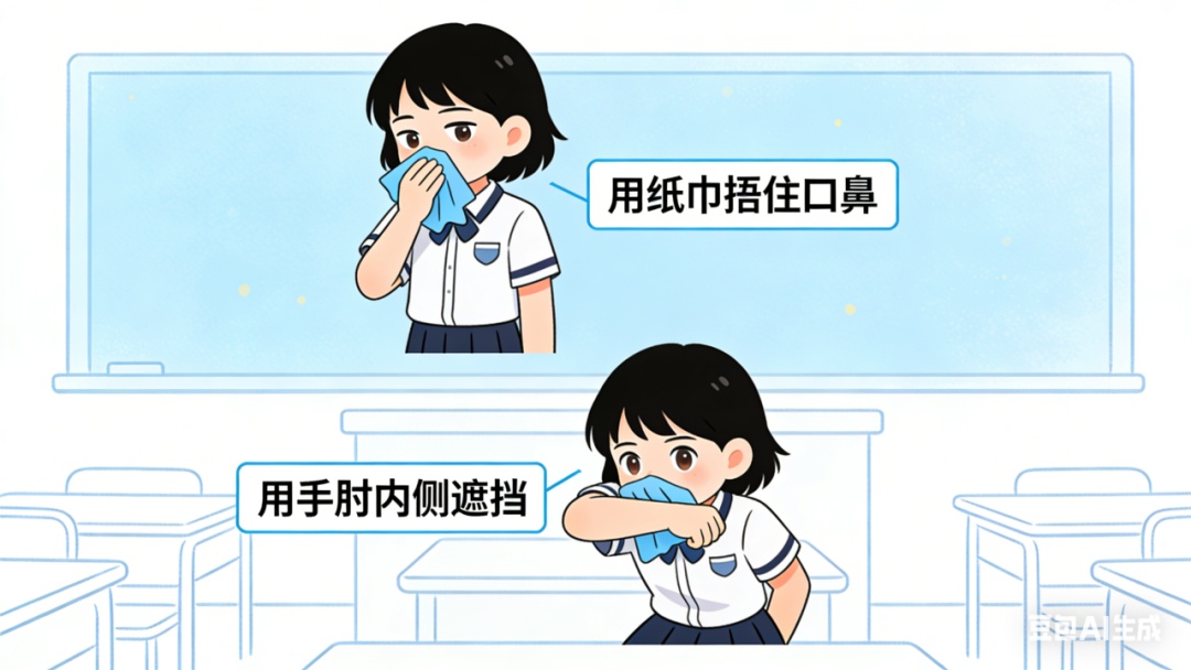 咳嗽或打喷嚏时,记得用纸巾或手肘内侧遮住口鼻,避免飞沫传播。