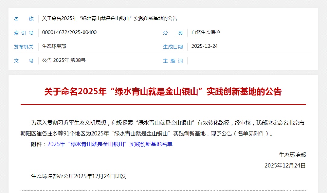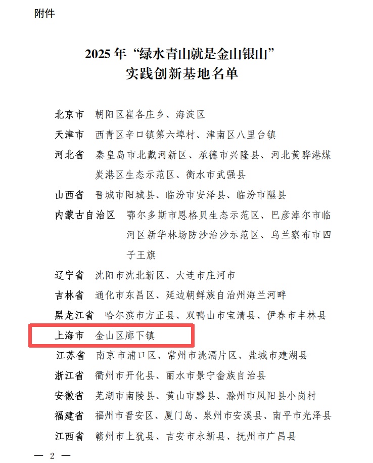 12月24日至25日,2025年生态文明论坛在北京召开。会上,生态环境部为2025年生态文明建设示范区和“绿水青山就是金山银山”实践创新基地命名授牌。我区廊下镇入选2025年“绿水青山就是金山银山”实践创新基地,成为今年上海唯一入选的街镇。