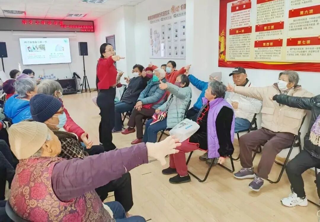 一早,程桥一村居民活动室内传来阵阵欢笑声,老年居民们坐在椅子上,跟随驻站心理咨询师一起开心地做起手指操、椅子操。