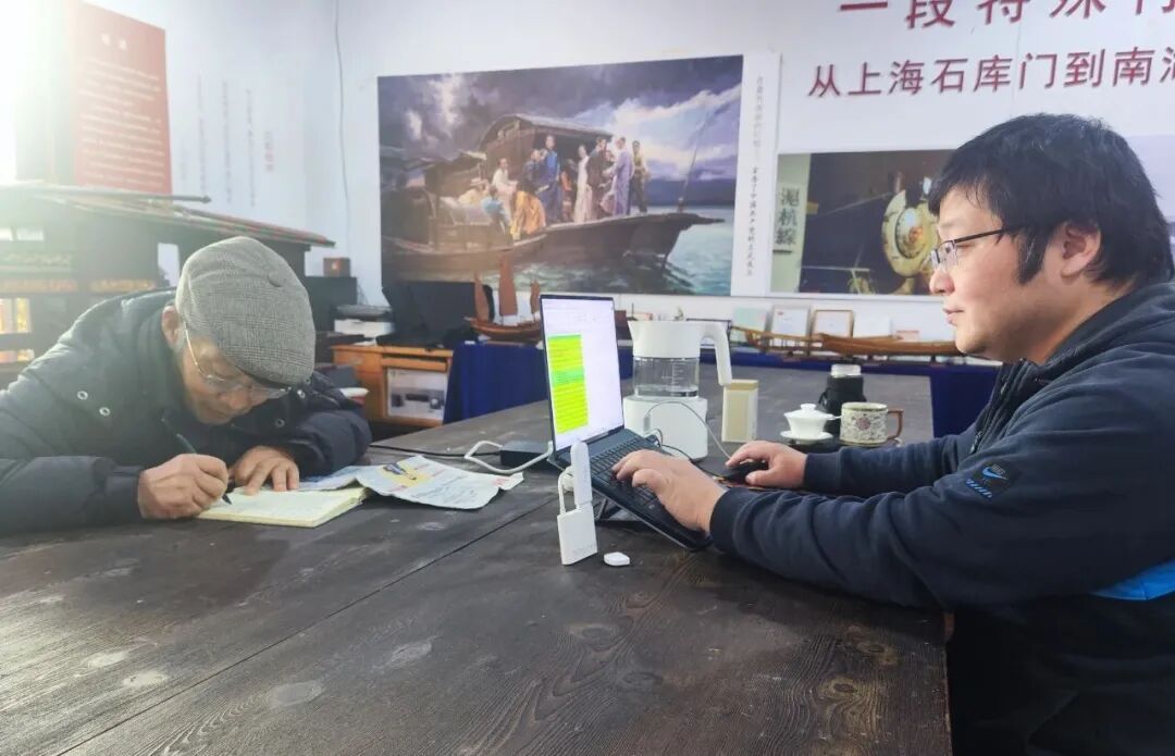 走进位于梅陇镇联曹路838号的杨生美船模工作室展示厅,“造船达人”、闵行区非物质文化遗产代表性传承人杨生美和他的儿子杨骋正隔桌而坐。长桌一边,杨生美如往常一样,用钢笔仔细书写近期的工作摘要;另一边,杨骋则在电脑前飞速敲击键盘,整理活动讲义。