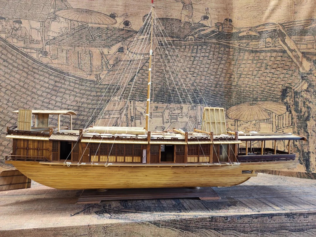 杨生美信奉“只做难的、不做会的”。为复刻南湖红船,他六下嘉兴,考据史料,最终以百艘精致柚木模型献礼百年。为复原战国“艅艎号”,他在古籍中寻得“括席千里”的线索,断定以篾席为帆,破解难题。耗时六年完成的《清明上河图》宋代舟船系列(共24艘),更是他学术与技艺的巅峰之作,堪称一部立体的中国古船技术史。