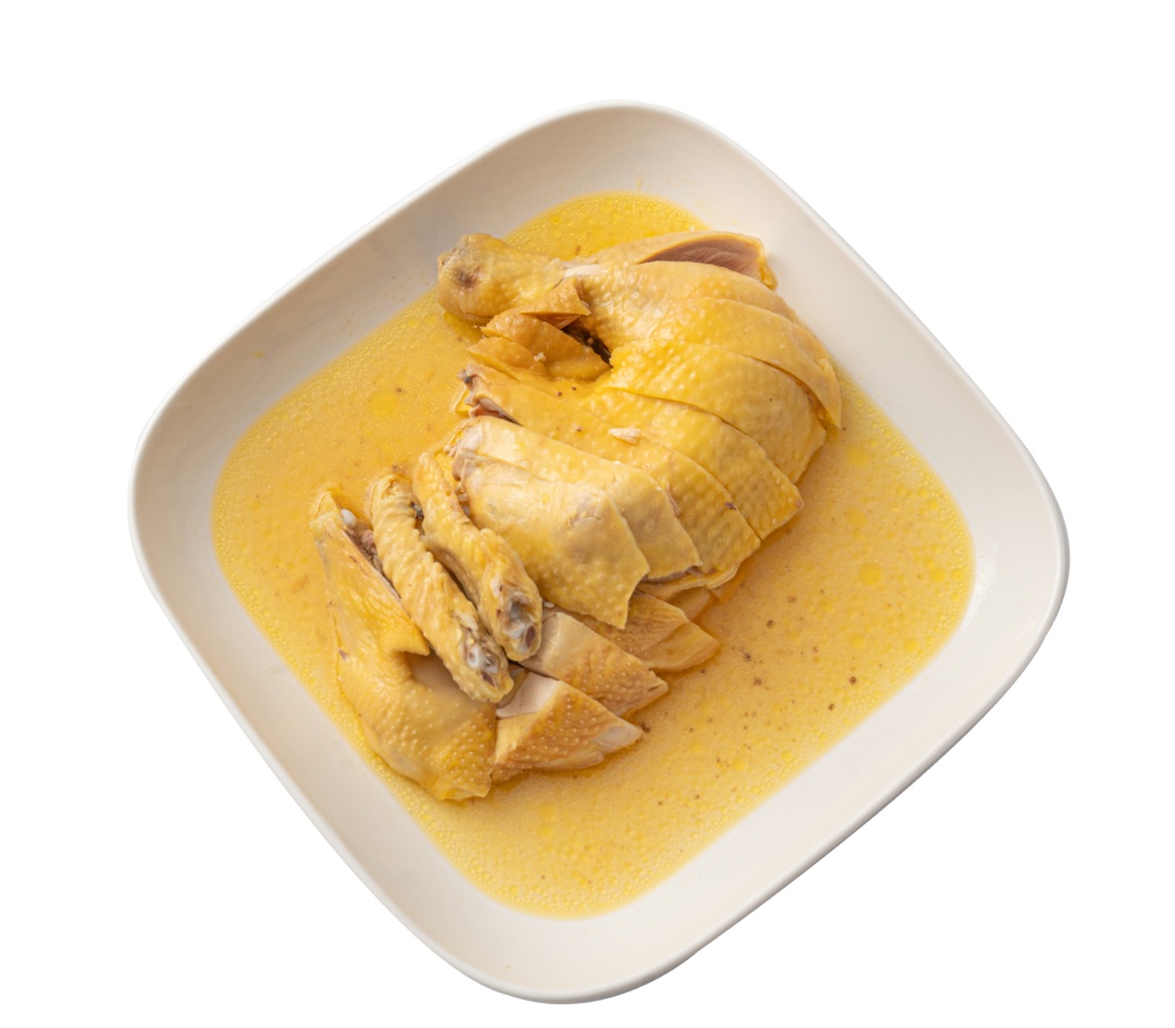 橘园散养土鸡清蒸而成。皮色金黄,肉质如玉,口感鲜嫩多汁,鸡味浓郁,皮滑肉嫩,入口紧实,少油腻感,且带有独特的鲜味,尽显崇明食材的本味特色。