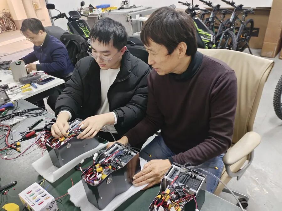 能量达到5度电、重量不超过5公斤,是智元对燃料电池的要求。如果实现这一目标,人形机器人的续航时间将超过6小时,处于国际领跑地位。为此,宋珂团队设计了5个方案,将逐一测试哪个方案最优。与济美竞争的晶擎已研发出氢能两轮车动力系统。晶擎总经理高鞠介绍,人形机器人与氢能两轮车的动力系统有相似性,都要满足续航长、体积小、启动猛三大要求。公司计划在现有产品基础上,把燃料电池的能量密度做到极致。高鞠(右一)带领团队研发氢能两轮车动力系统|晶擎供图