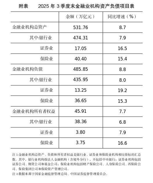 初步统计,2025年3季度末,我国金融业机构总资产为531.76万亿元,同比增长8.7%,其中,银行业机构总资产为474.31万亿元,同比增长7.9%;证券业机构总资产为17.05万亿元,同比增长16.5%;保险业机构总资产为40.4万亿元,同比增长15.4%。