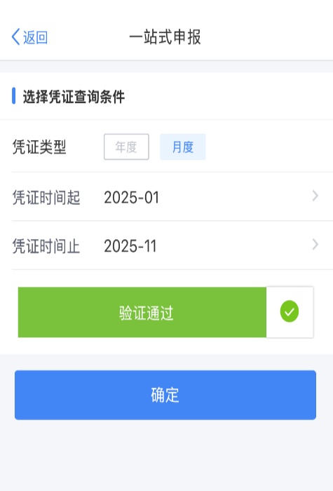 (一)选择“一站式申报”,选择【凭证类型】和时间,出现【凭证信息确认】,确认无误后点击【下一步】。
