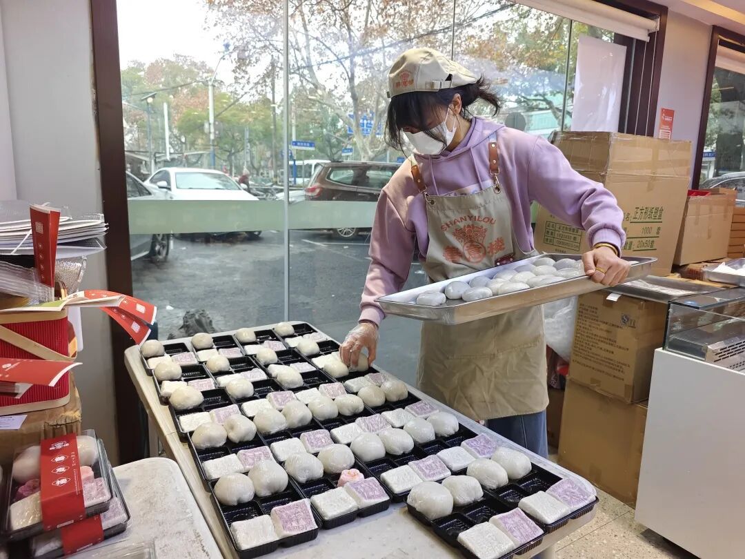 不仅是老字号人气火爆,新式糕点门店也同样热闹。一大早,位于城桥镇的善意楼手工坊刚一开门,就迎来了不少前来选购的市民。货架上,崇明糕、圆子、小米糕、印糕等各类传统糕点摆放得整整齐齐,浓郁的米香扑面而来。市民们仔细挑选着心仪的糕点,除了满足自家食用外,不少人还预订了走亲访友用的礼盒装。“像崇明糕、崇明圆子、南瓜饼、草头饼这些崇明传统糕点一直都卖得挺好的,节庆日期间,礼盒预订情况也不错。”工作人员告诉记者。