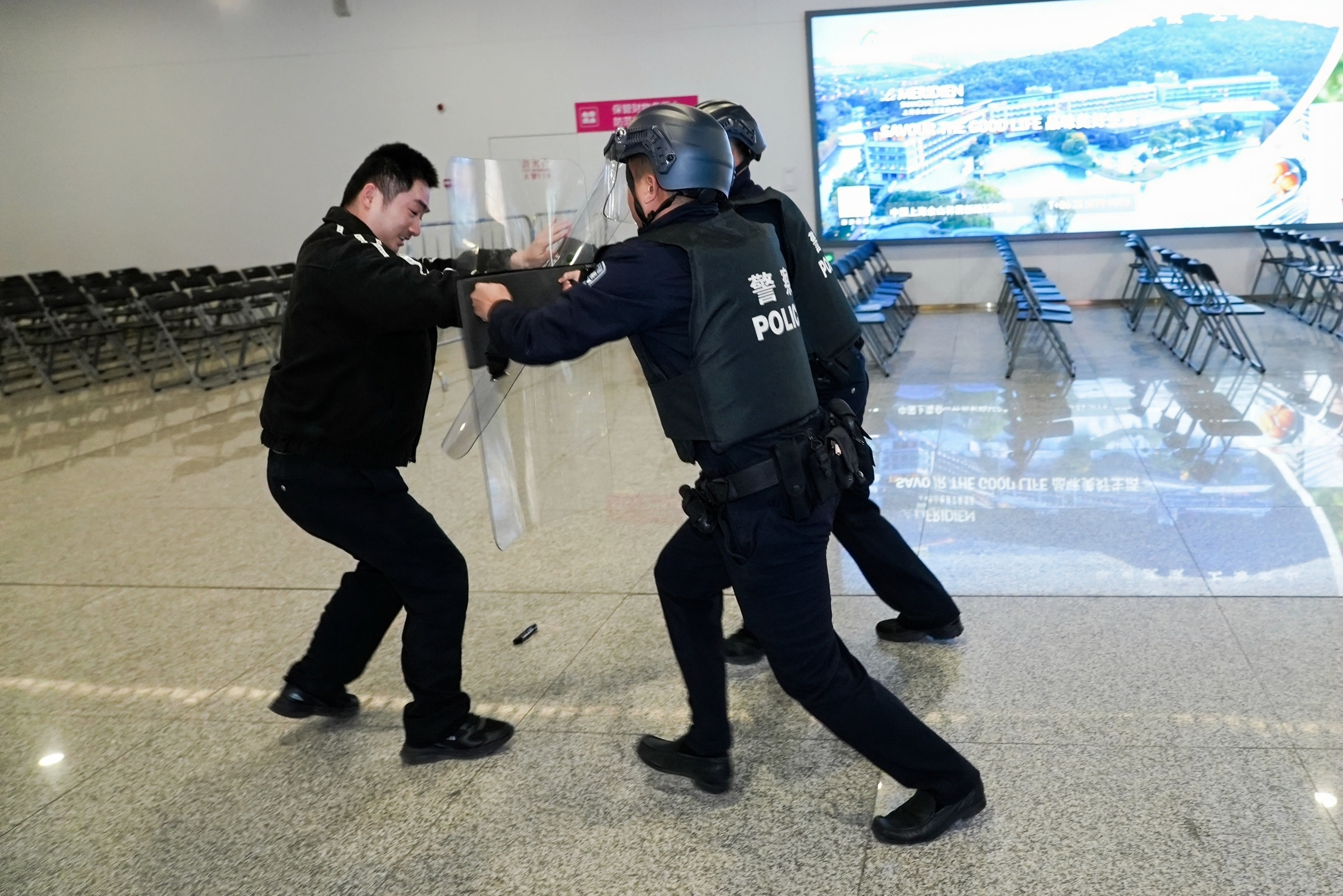 科目一演练在枢纽负一层乘客临时休息区开展,该区域为夜间过渡旅客主要集散地,春运客流峰值超2000人。突发持刀伤人警情后,现场巡逻特保及防爆人员立即携带盾牌、钢叉等装备赶赴现场,稳控现场,隔离风险;物业同步疏散周边旅客,永丰派出所1分钟点位民警到场,设置警戒区域、放置遮挡牌,随后2名民警着防刺服依法控制嫌疑人并带离。公安同步完成现场取证与信息上报,区卫健委120急救力量及时到位,对伤员开展专业救治与转运。
