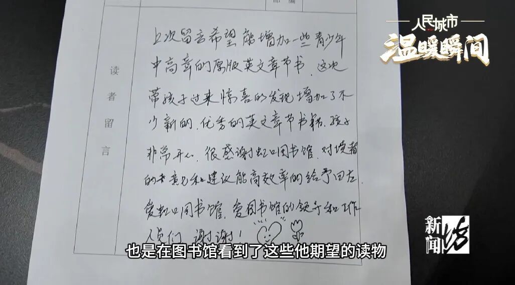 读者希望采购一些“中高章”的少儿读物。我们之前不知道“中高章”到底是什么意思,特地去查阅了一下,然后通过跟书商的沟通,找来了词汇量比较大一点的书目。读者之后在图书馆看到了这些他期望的读物,给我们留言本上做了感谢的回复。