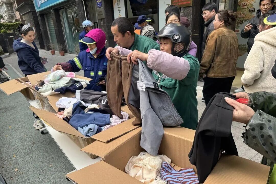 爱心义卖摊位前挂着厚实的外套、保暖内衣、围巾手套。这些由周边爱心企业捐赠的物资,以远低于市场的价格提供给有需要的户外工作者。环卫工张阿姨挑选了一件深蓝色的衣服,试穿后脸上露出满意的笑容: