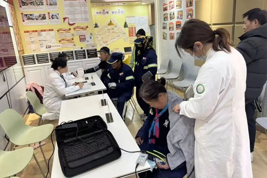 江宁路街道社区卫生服务中心的医生们正忙着为户外工作者们测量血压、解答健康疑问。