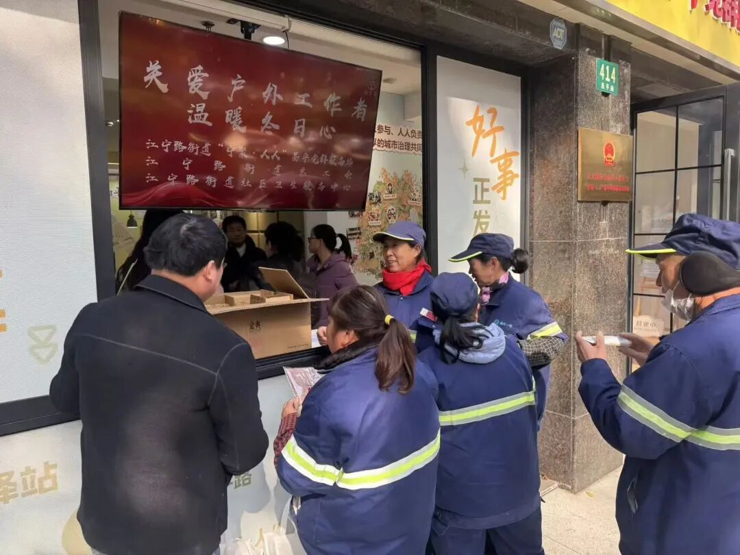 中午十二点刚过,站内已是一派暖意融融,江宁路街道总工会为他们送上护手霜作为冬季关怀礼。同时,党群服务站为他们准备了各项贴心服务,让这个平常的工作日午间变得格外温暖。