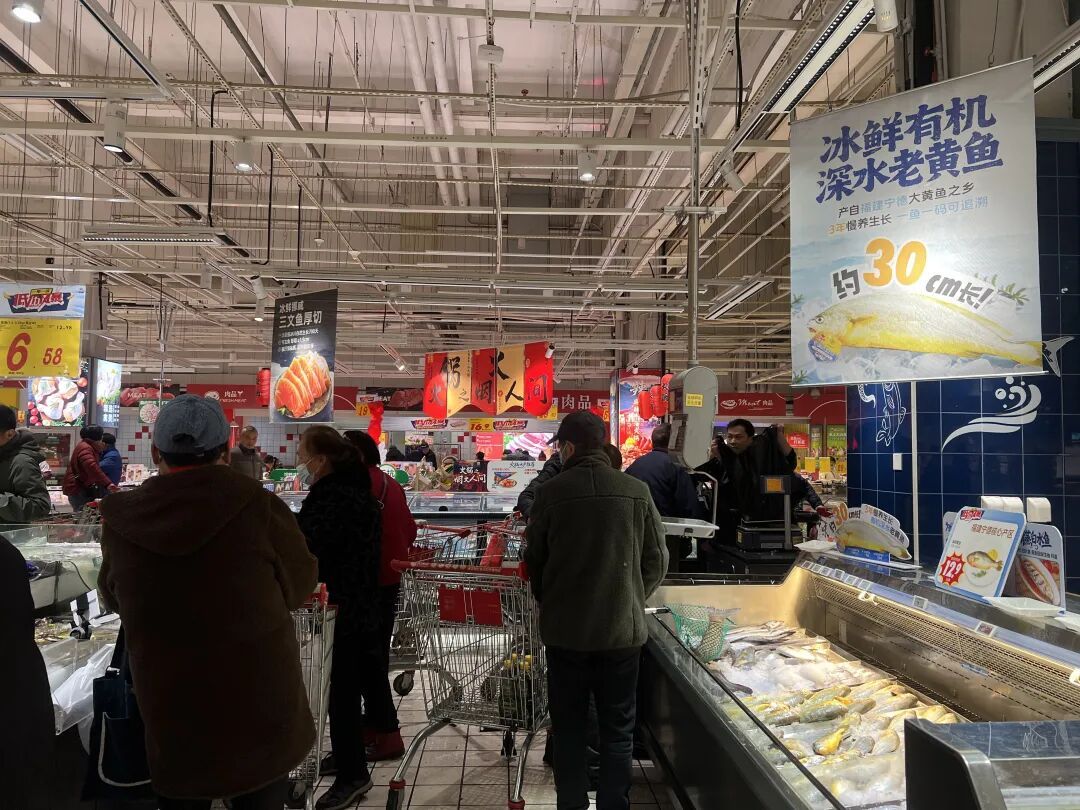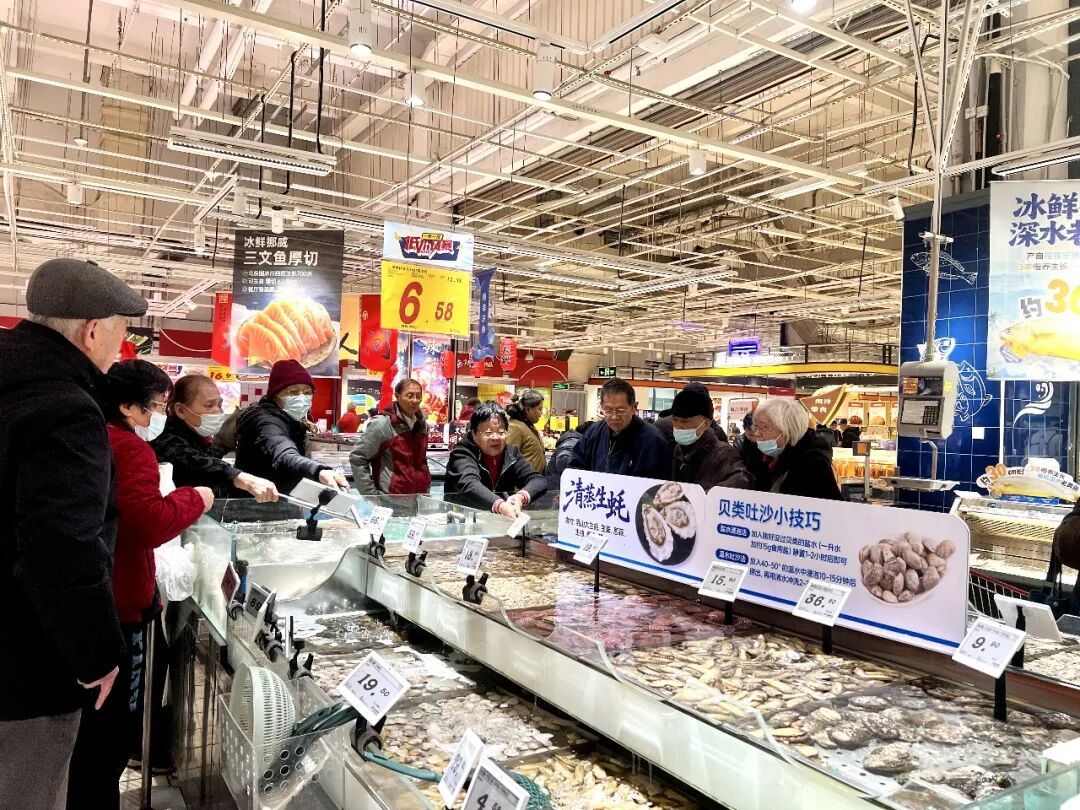 生鲜区更是人气爆棚,摊位前购物车排起长队,工作人员忙而不乱地为顾客拣鱼、称重、装袋。