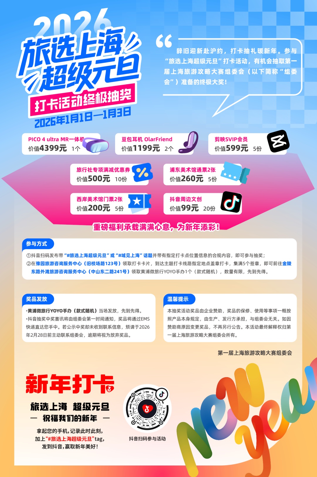 2026年1月1日-3日,只要你在任意点位,带上 #旅选上海超级元旦 话题发个抖音,就有机会抽终极大奖!