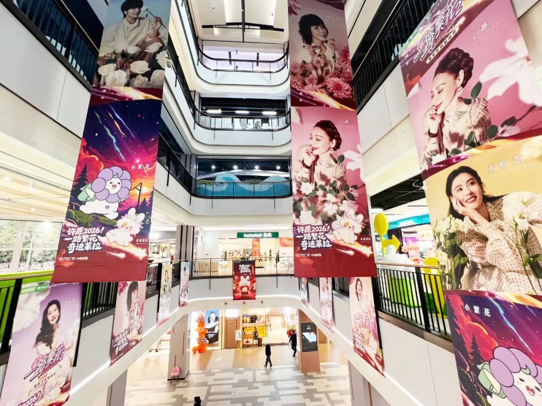 商场内部空间同步焕新,特别在一楼珠宝区域布局了以热播综艺《一路繁花2》为主题的巨幅海报艺术装置。该装置视觉上贯穿多个楼层,海报幅面实际覆盖至四五层楼高度,形成纵贯空间的沉浸式“繁花”画卷,打造出极具冲击力的“独家痛楼”景观。