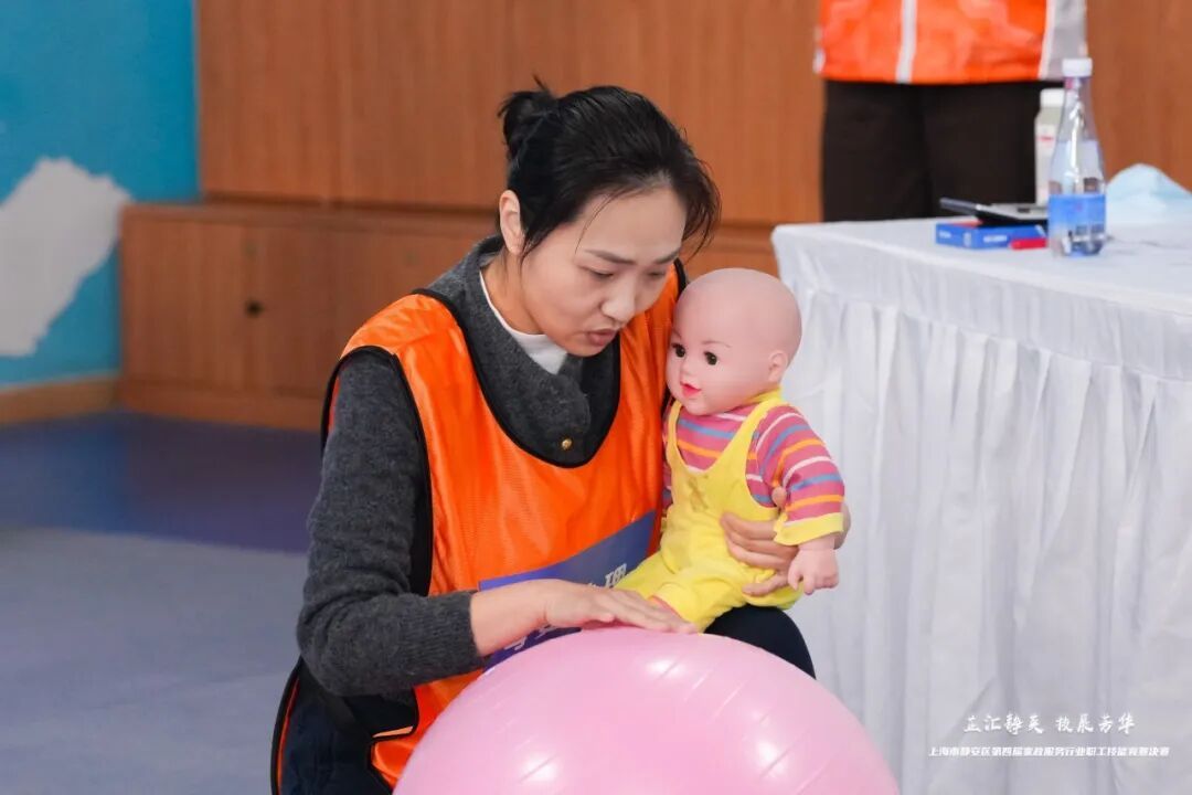 母婴护理区里,选手们轻柔地为仿真婴儿进行抚触、喂哺与交流,娴熟的动作间始终伴随着温柔的低声安抚,还原了充满爱意的真实照护场景;