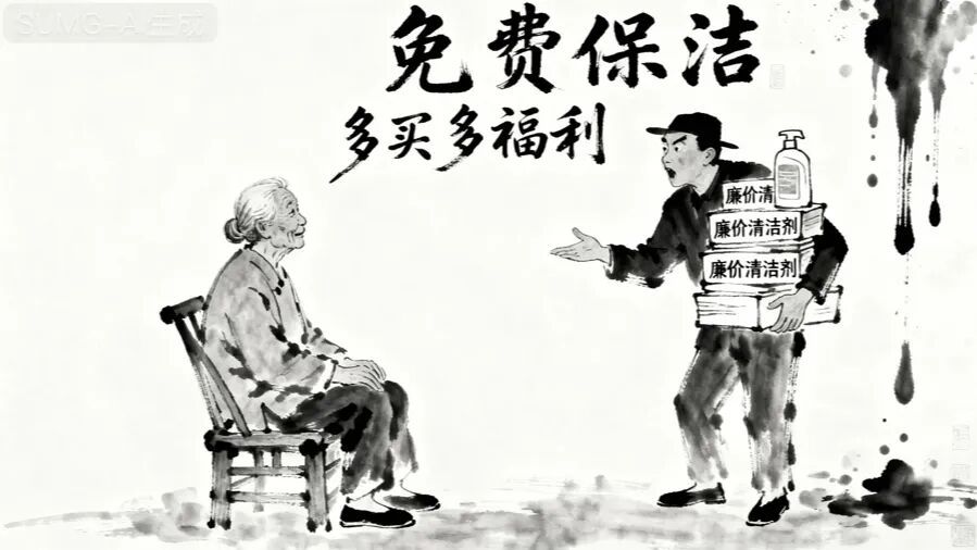 有人登门提供免费保洁,岂不是“天上掉馅饼”?当心,连环陷阱等着贪小利的人呢!近日,徐汇区人民检察院办理了一起以“免费保洁”为诱饵,实则高价兜售清洁剂的诈骗案件——不法分子瞄准老年群体,打着“免费保洁”“多买多福利”的旗号,以话术推销、情感绑架等手段,诱导老年人购入价格畸高、远超实际需求数量的廉价清洁剂,30余名老人被骗20余万元。