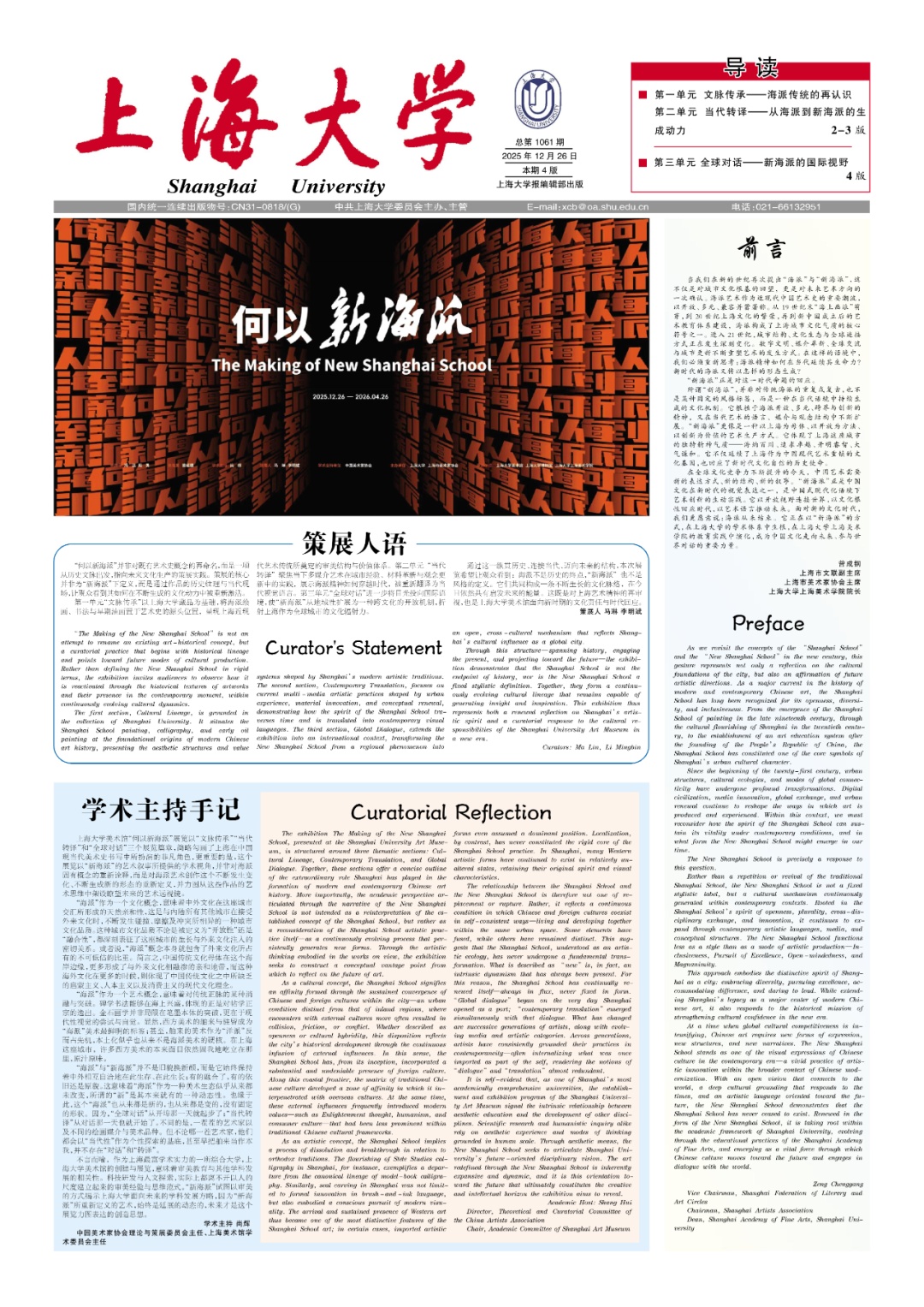 上海大学美术馆将与上海大学博物馆、校史馆等施行一体化管理,在功能定位上明确指向公共性与学术性并重。一方面,将以系统化的学术展览回应中国美术发展中的重大问题,参与当代艺术话语的建构;另一方面,也将通过面向社会公众的开放展览与教育项目,推动艺术资源共享,提升公共美育水平。“何以新海派”展览正是既立足学术前沿,又面向城市与公众这一理念的集中呈现。
