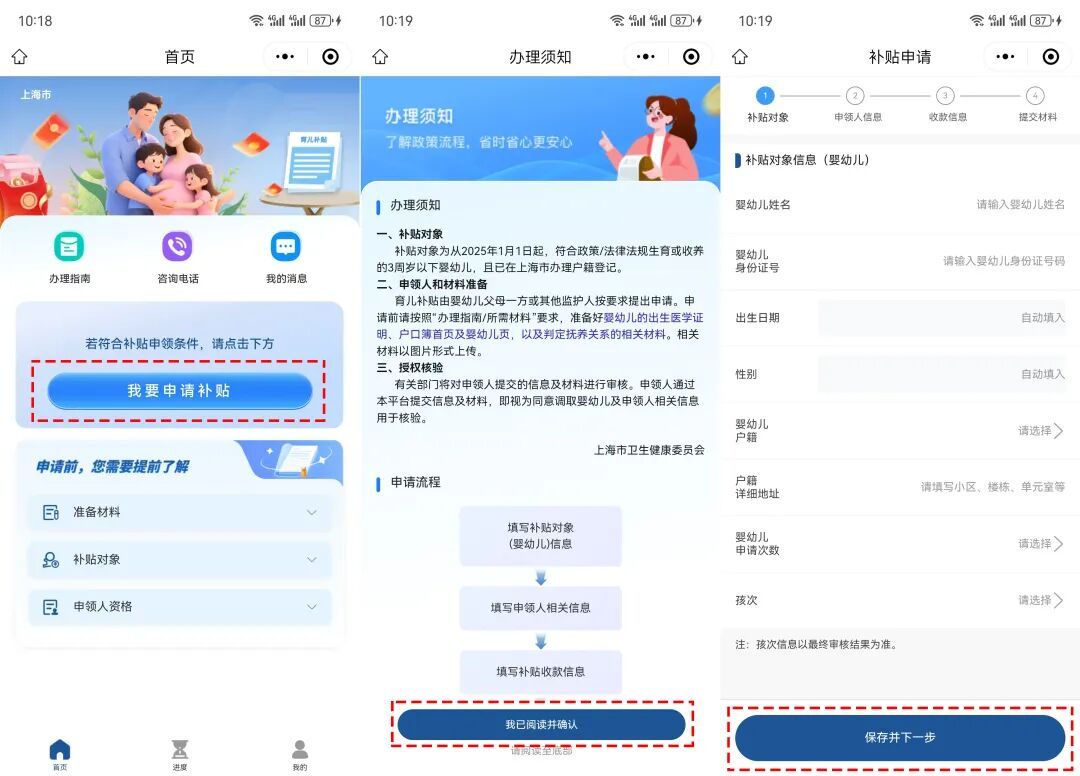 3.点击“立即申领”,选择“我要申请补贴”,查看办理须知及申请流程后,开始在线办理。按指引填写婴幼儿信息、申领人信息及收款账户。