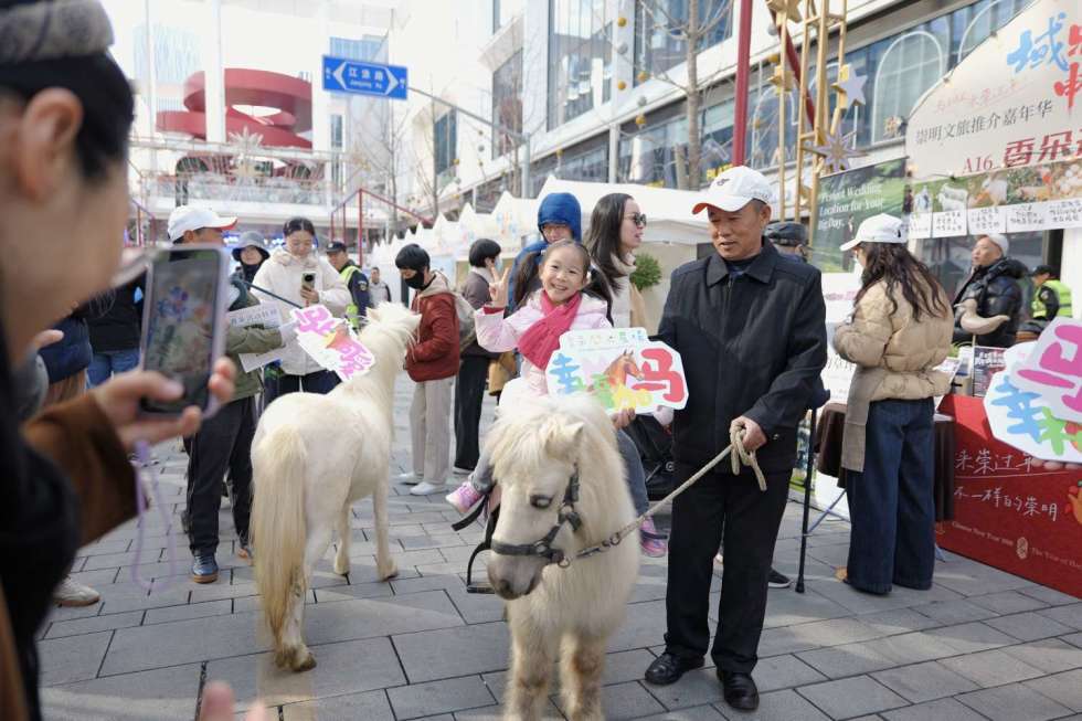 明年是农历马年,两匹白色小马惊喜亮相前滩公园巷,让游客纷纷为之驻足停留。两匹小马的马背目测不过一米高,性格温顺,格外惹人怜爱。大人撸撸马鬃,孩子则在工作人员指导下上马骑乘,充满欢声笑语。