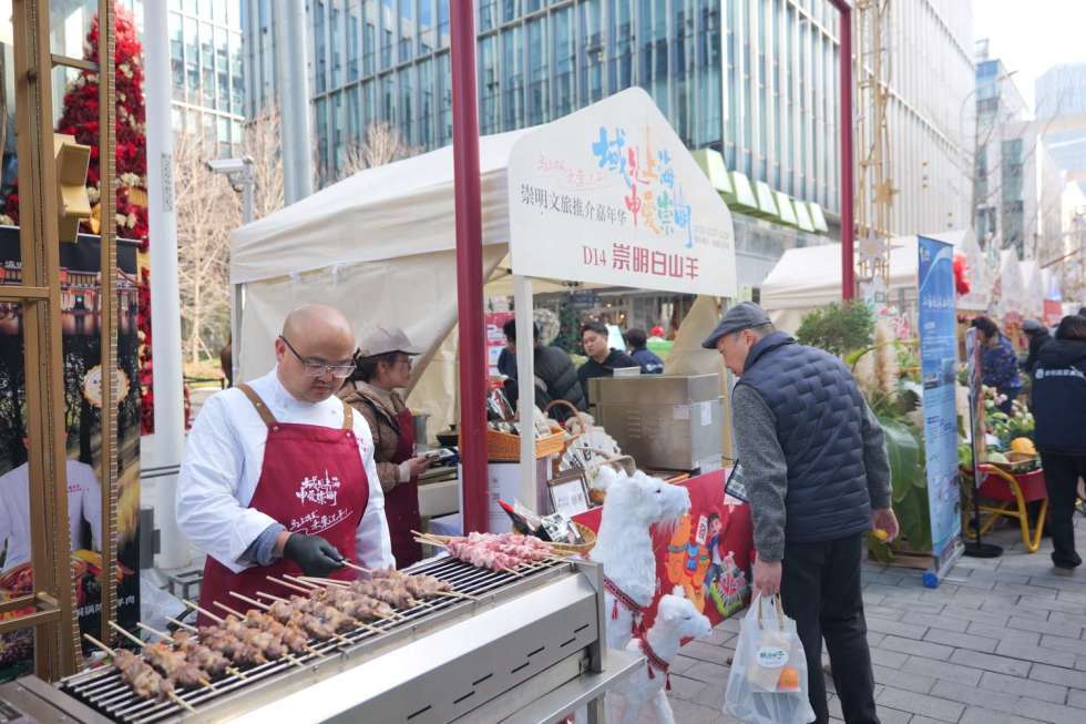 现场,市民游客能以优惠价选购特色年夜饭、预定民宿、订购特色农产品、品尝特色美食。用非遗美食崇明白山羊制作的羊肉串,现场烟火缭绕,销售格外火爆。“我们带来了大约200串羊肉串,不到中午12点,只剩下不到30串。” 瀛洲宴展位负责人王先生说道,“还是带少了,下午就要补货。”