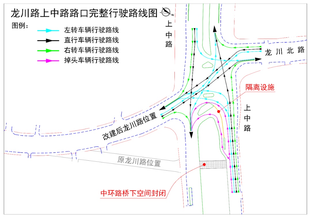 1.原上中路东向西掉头车辆由中环路桥下空间、龙川北路上中路交叉口掉头;提升后中环路桥下空间封闭,掉头车辆请至龙川北路上中路路口掉头。