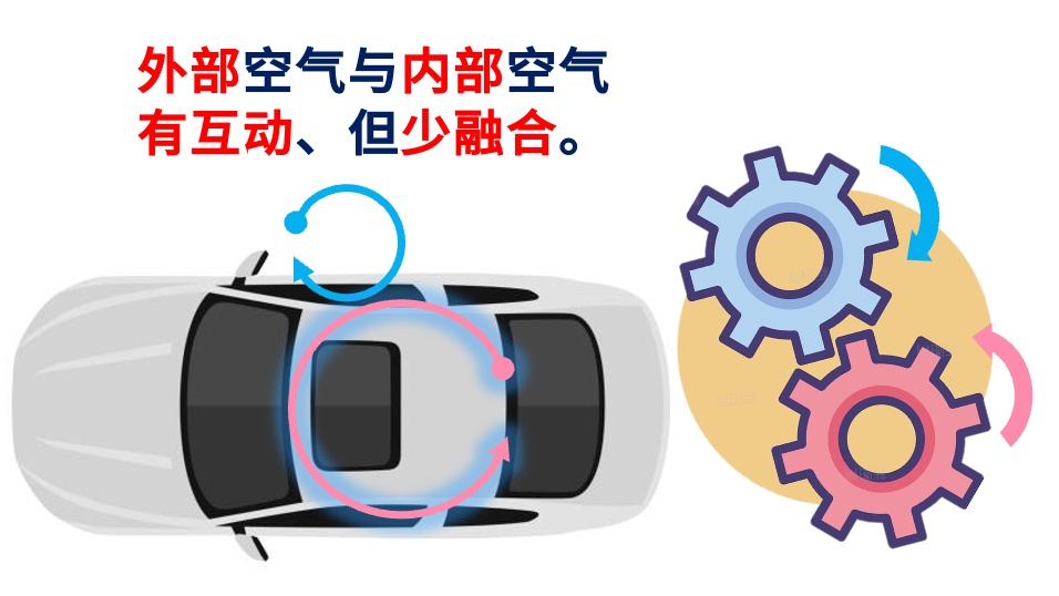 车内的空气也在转。车窗内外的空气涡流,像是两个齿轮,依靠空气的粘性相互啮合,你动才能让我动:窗口外兜圈的空气回流,驱动车内的空气跟着循环。