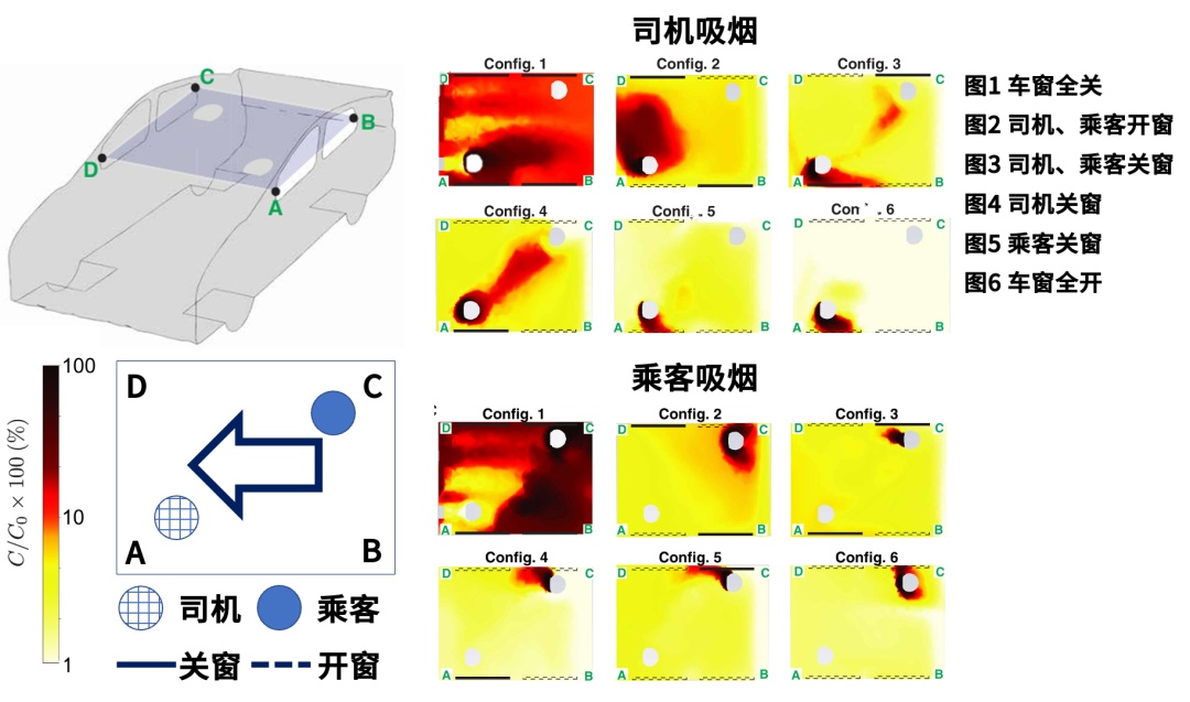 前排吸烟时,只要前窗参与排气,绝大部分烟都能被迅速带走(见图2、图5);相反,吸烟一侧若关窗,其他座位的浓度会明显上升(见图3、图4)。