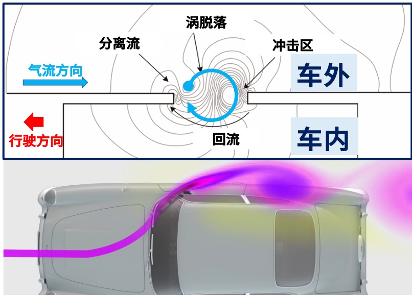 宽带风噪主要来自气流在后视镜、A柱、行李架横杆等处发生分离,形成湍流,随后拍打玻璃和门框并通过结构传入车内。开窗时,贴着耳边掠过的劲风也会产生显著的噪声。