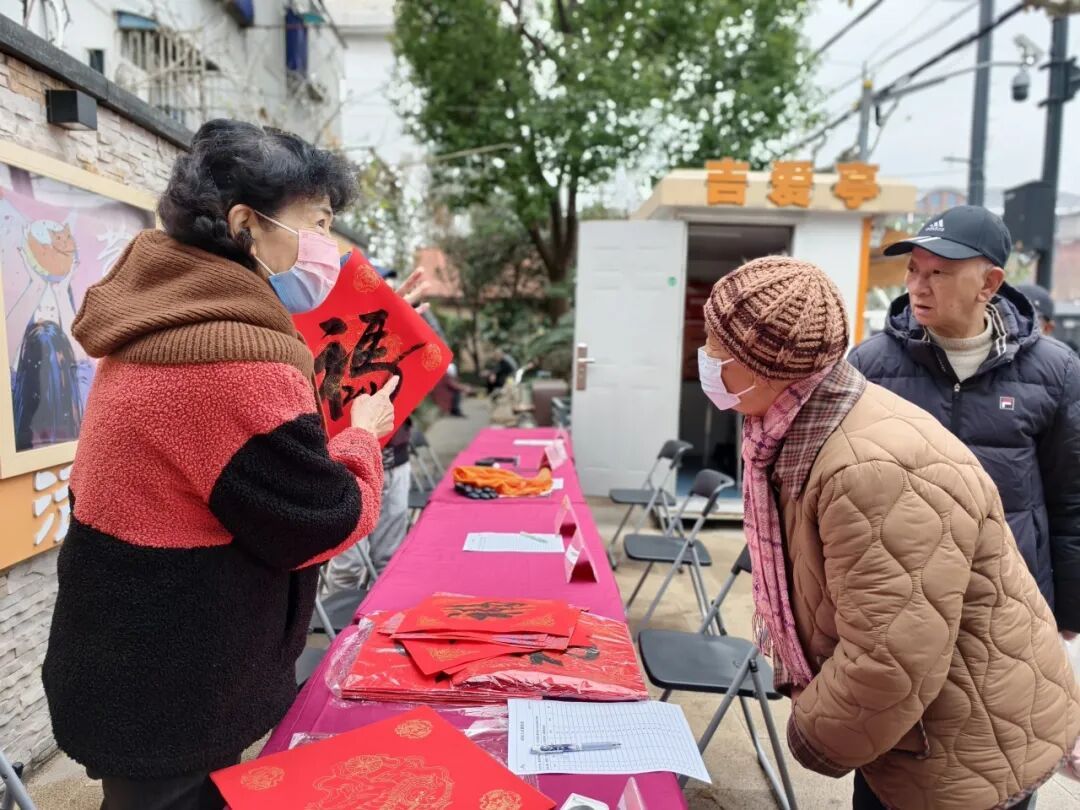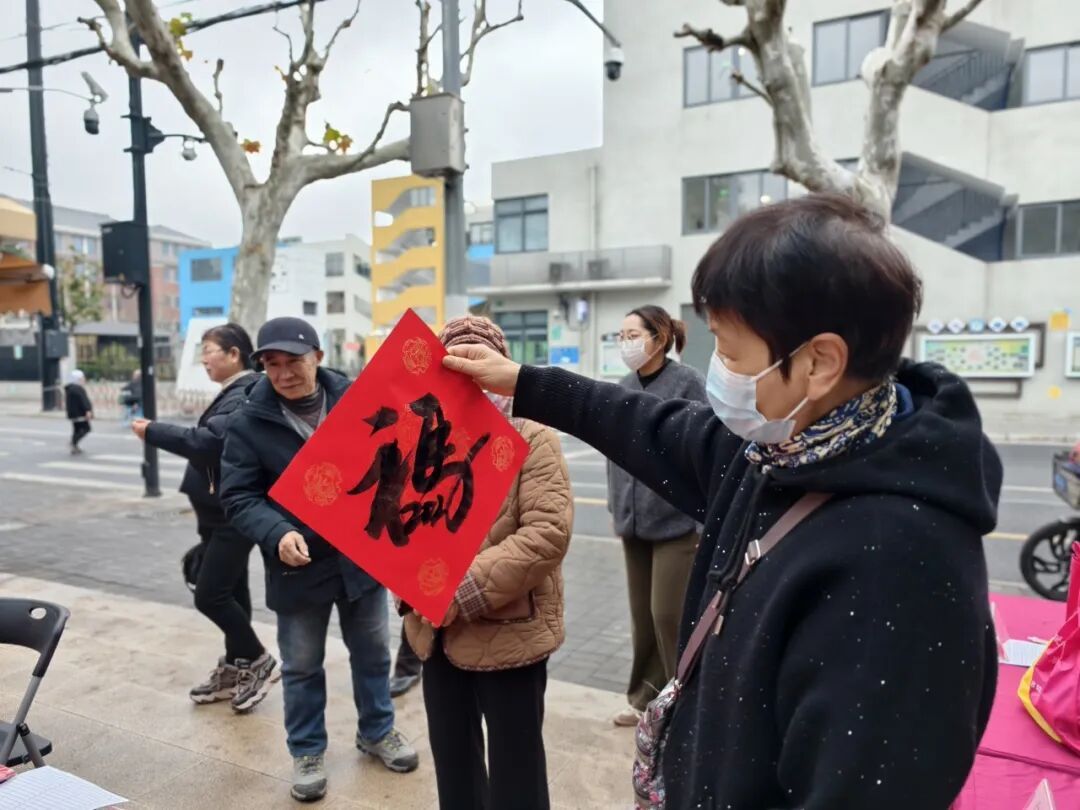 书法老师们挥毫泼墨,笔锋起落间,一个个饱满厚重、遒劲有力的“福”字跃然纸上。这并非千篇一律的印刷品,每一笔都带着温度、寄托着对新年的祝愿。围观的阿姨爷叔笑逐颜开,有人迫不及待接过刚写好的“福”字,对着阳光细细端详;有人小心翼翼捧在手里,仿佛捧着的是一整年的平安顺遂。