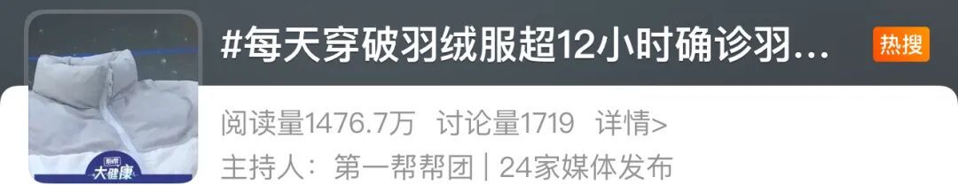 原来该男子连续4周每日穿着羽绒服超过12小时,且所穿羽绒服为网购低价商品,内衬已有破损,稍一活动便有羽绒纤维从接缝处飘出。