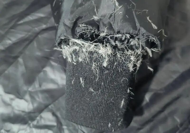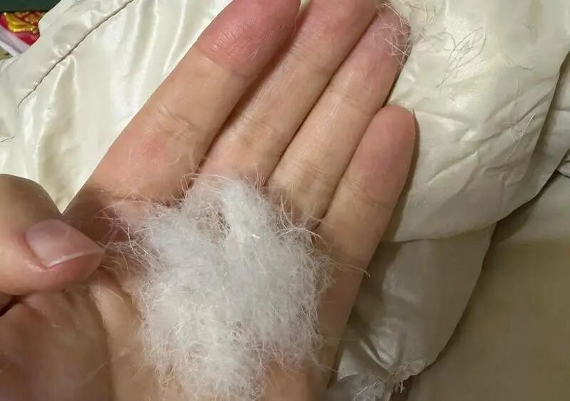 内衬或接缝处破损导致羽绒纤维持续外漏。