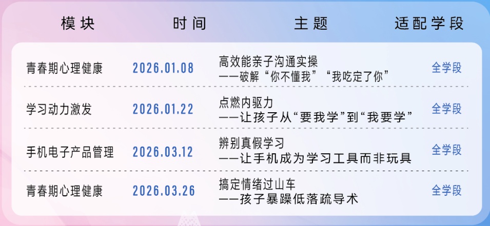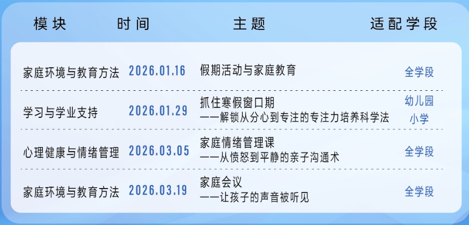 2026年1月16日18:30,特邀华东师范大学教授刘良华,开设家长夜校主题讲座《假期活动与家庭教育》,一同探讨如何构建一个融洽的家庭氛围,让孩子度过一个充实有趣的寒假。