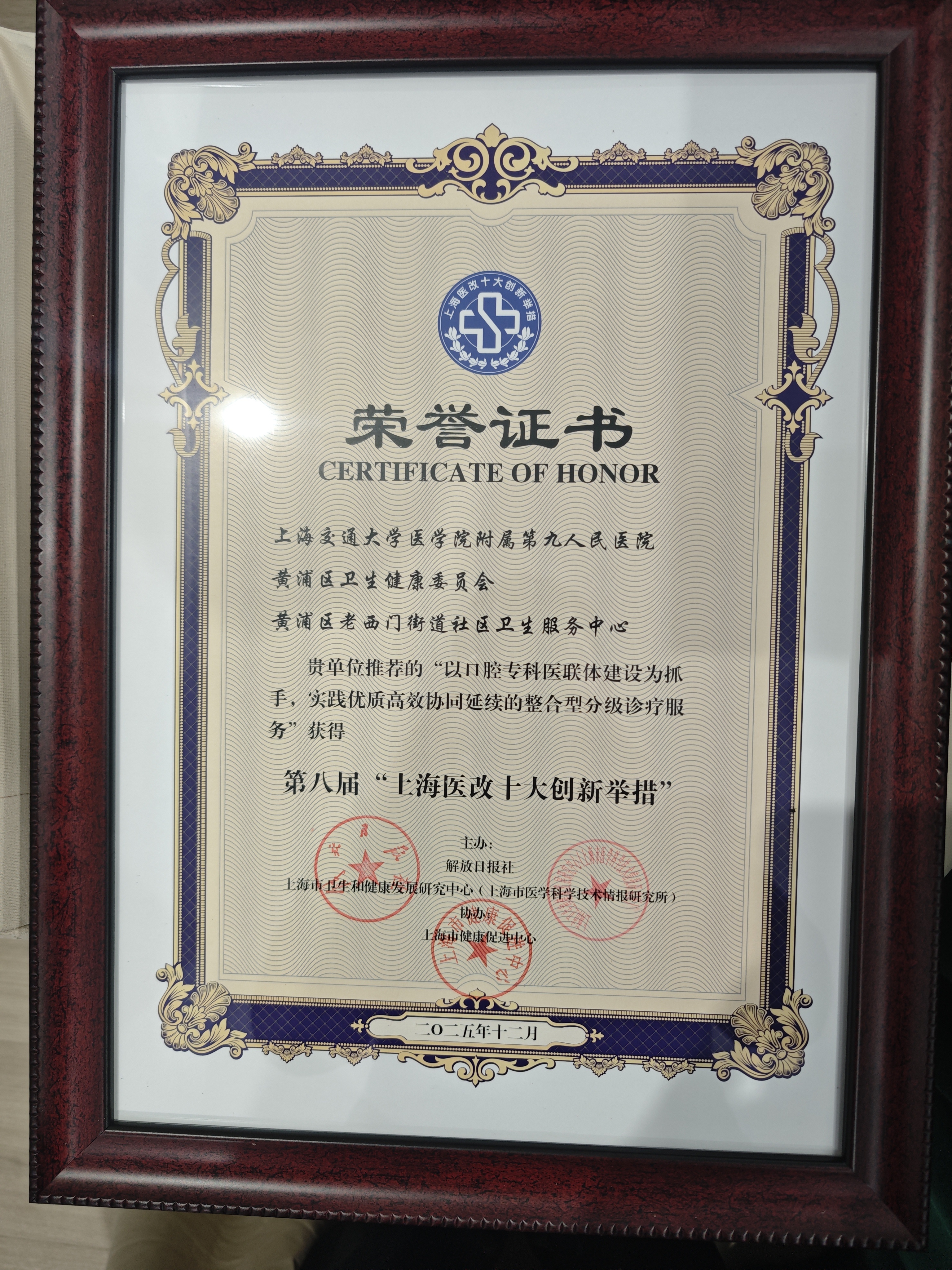 由上海交通大学医学院附属第九人民医院、黄浦区卫生健康委员会、黄浦区老西门街道社区卫生服务中心联合申报的“以口腔专科医联体建设为抓手,实践优质高效协同延续的整合型分级诊疗服务”,荣获本届“上海医改十大创新举措”。此举措借助国家口腔医学中心及综合性医院资源,以社区标准化口腔诊室建设为起点,构建三级联动整合型服务模式。它建立“基层首诊 + 精准分诊”机制,优化转诊流程,开展急慢分治双轨实践,还打造“医教研”联动体系,在优化口腔卫生服务体系、推动资源下沉、提升就医便捷与效率等方面,提供了可借鉴的示范样本。