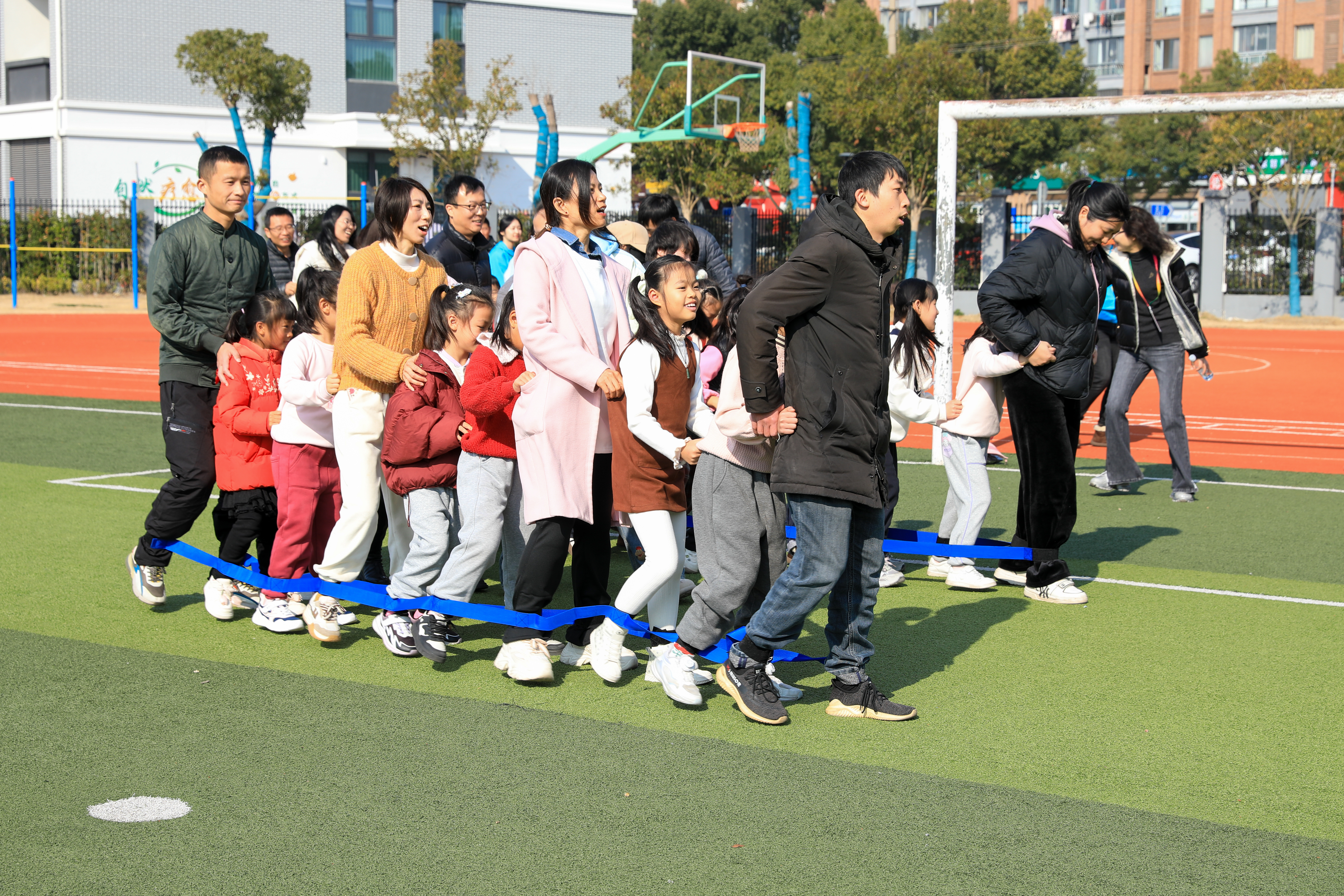 当天的活动既有理论“充电”,也有令孩子们欢呼雀跃的亲子运动游戏大PK。在松江区未成年人心理健康辅导与家庭教育指导中心教师宋润敏的带领下,大家前往户外组队开赛。在“联合舰队”游戏中,家长与孩子双脚被束缚、依次排列,组成了四艘人形“舰队”。伴随着整齐的“左右左右”口号声,各“舰队”向前迈步。虽有人不慎绊倒,但大家也没泄气,通力合作顺利通关。在“跨越雷阵”游戏中,各个小队将团队协作发挥到了极致,经过多次尝试,最终成功绕过雷区抵达终点。参与游戏的姚芮琪小朋友兴奋地说:“特别好玩,不仅学到了知识,还收获了快乐!”