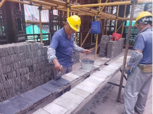 主要施工流程:现状勘察→破碎方砖拆除→材料选择→抄平标高→铺设垫层→试排→方砖铺设→填缝→表面打磨。