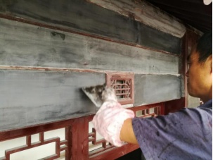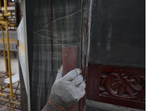 主要施工流程:清理表面→撕缝嵌补→涂刷底漆→做地仗→涂刷生漆→刷广漆。