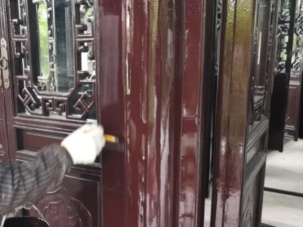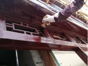 对建筑室内外木构件、门窗表面原有油漆进行出白,按传统做法重做广漆。