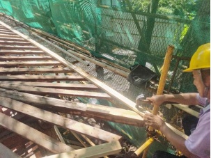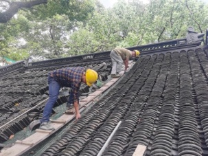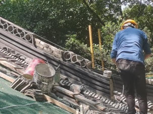 为了安全起见,考虑到卸荷均匀,应对称同步拆卸,采用人工卸瓦,严禁工人直接踩踏屋面筒瓦,应采用专用屋面“木攀梯”搭设在屋面上分担荷载,较少的对屋面瓦件的损坏。