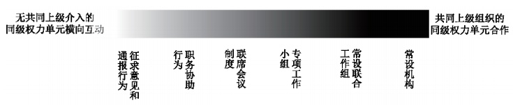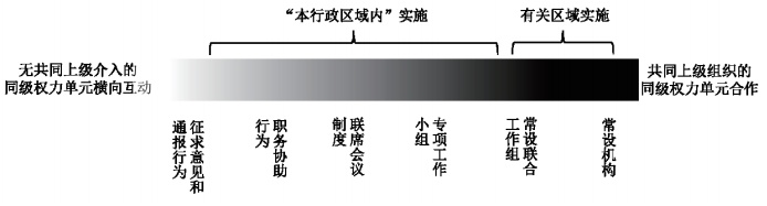围绕其“意义中心”,“区域协同”的权力结构特征、地理空间特征和功能目的特征弹性地有机结合为整体。其中,典型形象或标准形象意味着其完整具备三个特征,而一般形象意味着个别特征欠缺或显现较弱。当一般形象中的特征被替代,就会进入另一个类型的视域。通过不同特征的显现与隐退,类型之间不断转化,在“流动过渡”中形成“类型谱”。如果将“区域协同”类型的典型形象描述为,相互平行的同级权力单元依各自职权共同解决跨行政边界事项,以达到经济社会协调发展的权力横向运行状态;那么,随着权力纵向结构要素不断增加,横向结构要素逐渐消退,实践中的各类“区域协同”一般形象在类型谱上逐一呈现。根据“对极法”,在“区域协同”类型谱中,一极是多个相互平行的权力单元平等横向互动,没有共同上级的介入,是纯粹的权力横向结构;另一极是共同上级对多个下级权力单元的命令,没有平行的权力单元间的横向互动,是纯粹的权力纵向结构。从纯粹的权力横向结构这一极出发,随着权力纵向行使范围的增多,逐渐过渡到纯粹的权力纵向结构的一极。在两个“极端”之间的类型谱上,依次出现征求意见与通报行为、职务协助行为、联席会议制度、临时性专项工作小组、常设联合工作组、区域合作常设机构,共六种常见区域合作形式(参见图1)。第一种类型是征求意见和通报行为。这一类型有三种具体形式:一是权力单元独立起草与协同有关的内容,将草案发送给相关权力单元征求意见;二是多个权力单元委托其中一个权力单元进行起草,形成文本后,发给参与协作各方征求意见;三是各权力单元先同步分别起草,再相互进行意见征求。除了少数依法进行的外,征求意见和通报更多视工作惯例或工作便利程度进行,不需要权力的纵向介入,只需要同级权力之间横向的配合,因此这一类型距离纯粹的权力横向结构最近。第二种类型是职务协助行为。权力单元内的有关部门在遭遇跨行政边界事项时,因其缺乏管辖权,就需要请求另一权力单元的相关部门进行协助。职务协助在行政执法和司法过程中普遍存在,以个案或“集约式行为群”的形态出现。不论何种形态,职务协助行为是由一个权力单元发起,另一个权力单元响应参与的权力横向运用。这一类型组织性弱,难以常态化和制度化,更多存在于具体业务的操作惯例中。只有当平行同级权力单元之间发生管辖争议时,才需要共同上级的介入,从而出现权力纵向结构要素。第三种类型是以定期会晤为表现形式的联席会议制度。联席会议最初广泛运用于单个权力单元内的部门横向协调。随着跨行政边界问题凸显,这一类型在平行的同级权力单元之间流行起来,形成了诸如长三角地区行政首长联席会议、京津冀地区行政首长联席会议等形式。会议的召开、议题和达成的协同成果由参加联席会议的各权力单元共同决定,是权力横向运行的结果。但联席会议制度能否建立,需要由规范性文件规定,或是由共同上级批准,属于权力纵向运行的结果。地方行政首长联席会议和领导小组即为此种情形。与地方间职务协助行为不同,联席会议是一种常态化、组织性强的区域协同机制,权力纵向结构不只是在纠纷出现时介入,在联席会议形成之初,以及联席会议运行过程中,就已经“渗入”权力横向结构。第四种类型是临时性专项工作小组。专项工作小组是为解决跨行政边界事项中相对具体的任务,从相关地区抽调工作人员展开集体行动的协同方式。专项工作小组在任务完成后便解散,具有临时性和阶段性。因其以团队形式解决特定问题,组织严谨程度高于联席会议。部分专项工作小组需要在共同上级授意下设立。为了根据实际情况调整工作内容,参与主体还会成立联席会议,对专项工作小组下达命令,或是在具体事项上对专项小组进行授权,进行内部的权力纵向运用。第五种类型是常设联合工作组。相较于临时性专项工作小组,常设联合工作组需要解决的协同事项复杂,无法短期内完成任务并解散,需长期运行,组织化程度高。与专项工作小组相同的是,特定任务完成后,联合工作组应当解散。联合工作组设立时,需由上级机关设计或批准区域合作的空间范围、事项范围和运行框架。随后,平行的同级权力单元合意完成联合委员会的组建和运行。以沪苏浙联合成立的长三角一体化示范区执委会为例,其设立依据为国务院批复的《长三角生态绿色一体化发展示范区总体方案》(以下简称《长三角一体化总体方案》)。这一方案明确了执委会的成立主体、行权空间范围和行权事项。在执委会组建和运行环节,则由沪苏浙两省一市平等协商,从两省一市等比例抽调人员组成执委会,并由两省一市等比例进行财政拨款以提供执委会运行资金。需要注意的是,执委会的具体职权内容虽源于《长三角一体化总体方案》的设计,但是由沪苏浙省级权限授权而得,而非由中央授权。第六种类型是区域合作的常设机构。当这一类型出现时,权力的纵向运用起到主导作用,组织方式也按照一级政府或政府部门的形式展开。平行的同级权力单元通过合意无法设立跨行政边界的区域协同常设机构,在这一类型中,权力横向结构没有运行的空间。国务院为进行重点水域跨流域管理,在水利部下设立的黄河管理委员会、长江流域水资源保护局、太湖流
