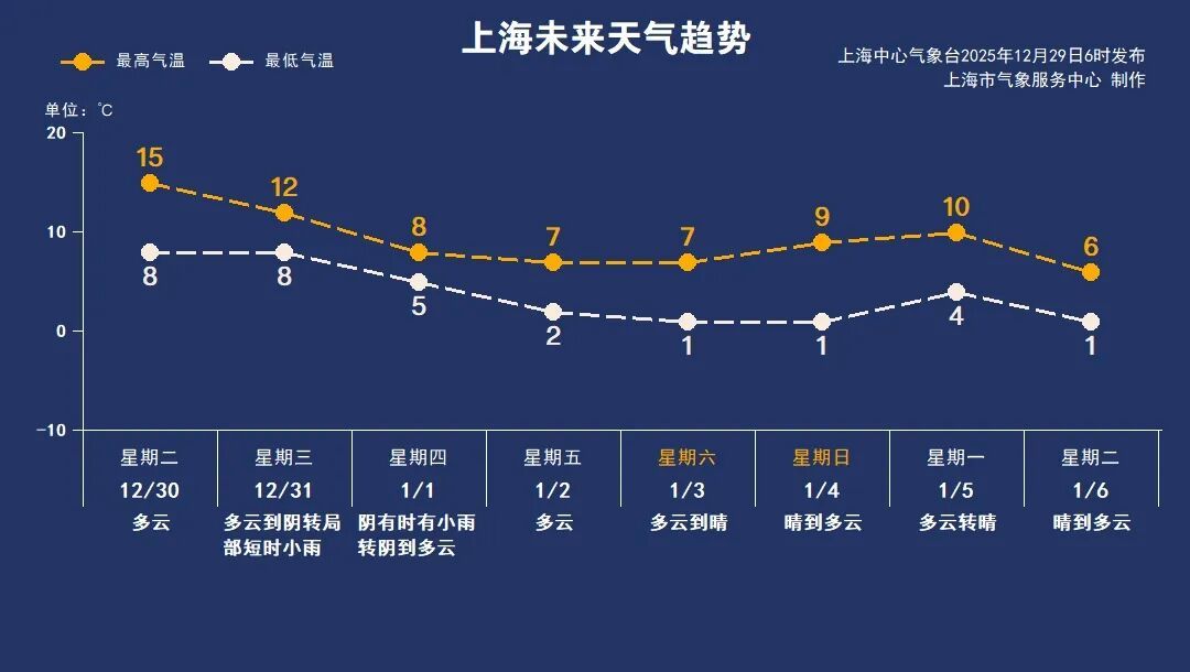 本周三前后将有较强冷空气影响申城,冷暖空气交汇,跨年夜气温下降并伴有大风和弱降水过程。周四全天气温仅在5~8℃之间,白天还有小雨,晚上雨止。1月2日以后天空状况转好,但受冷空气补充影响,气温依旧较低。市区早间气温仅在1~2℃,郊区气温跌至0℃以下。小长假内体感由湿冷转为晴冷,气温整体下降一个台阶,大家一定注意保暖。