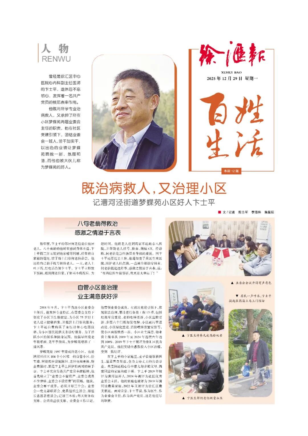 退休医生卞士平,在梦蝶苑小区里续写仁心与担当。他送八旬独居老人就医,平日嘘寒问暖,老人一句“有两位医生做邻居,真幸运”道尽了邻里的信赖。担任业委会主任后,他创建保健室、更新电梯、改造环境,带领自管小区,连续六年实现物业费100%收缴。他从治病到治区,用一名党员的赤诚,将医者仁心与奉献热忱,悄然融入社区焕新的点滴日常中。