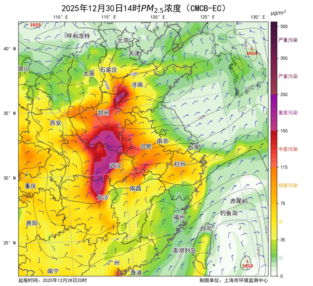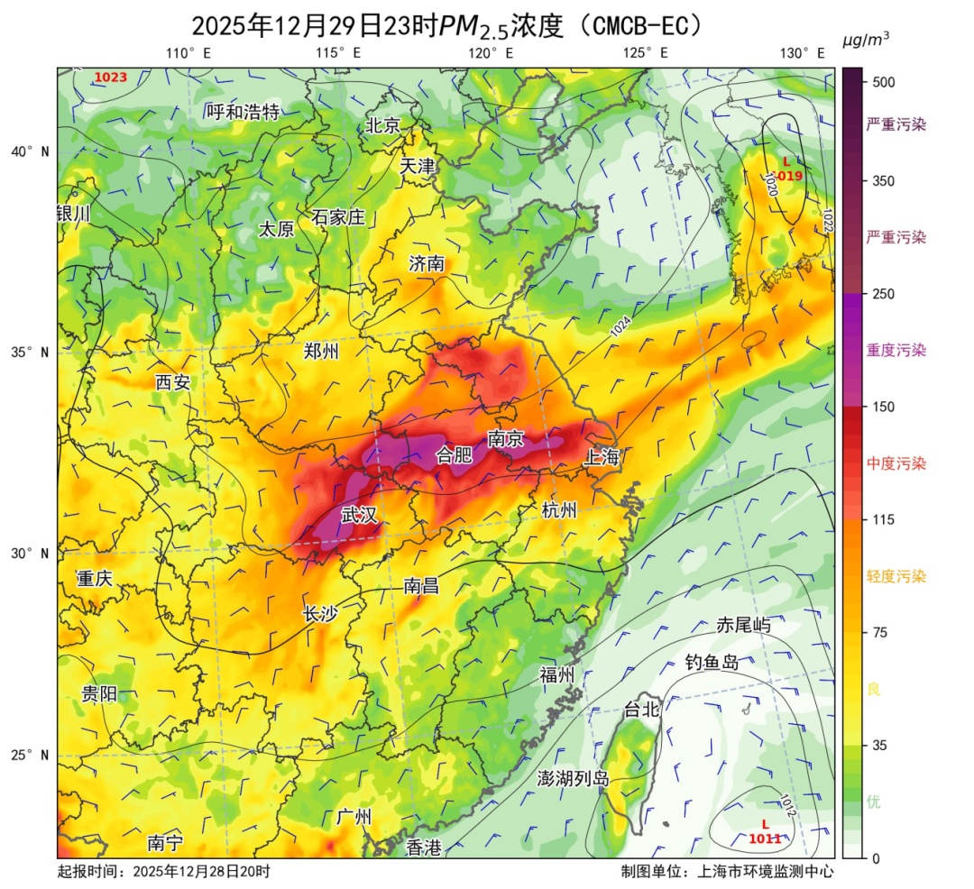 受不利气象条件影响,29日8时,河北南部、河南东部和山东大部出现PM2.5中度至重度污染,本市主导西南风0~1m/s,空气质量良。